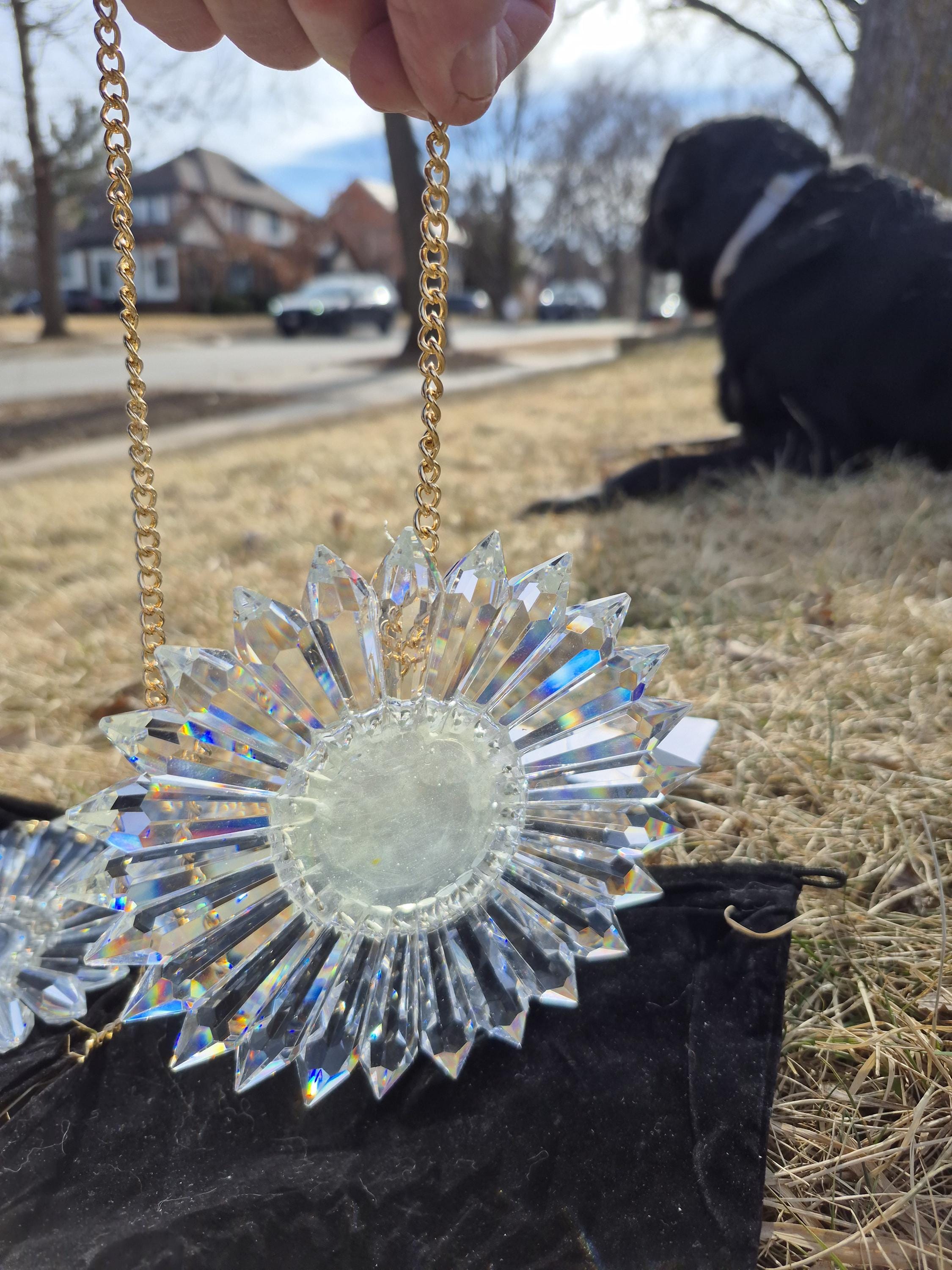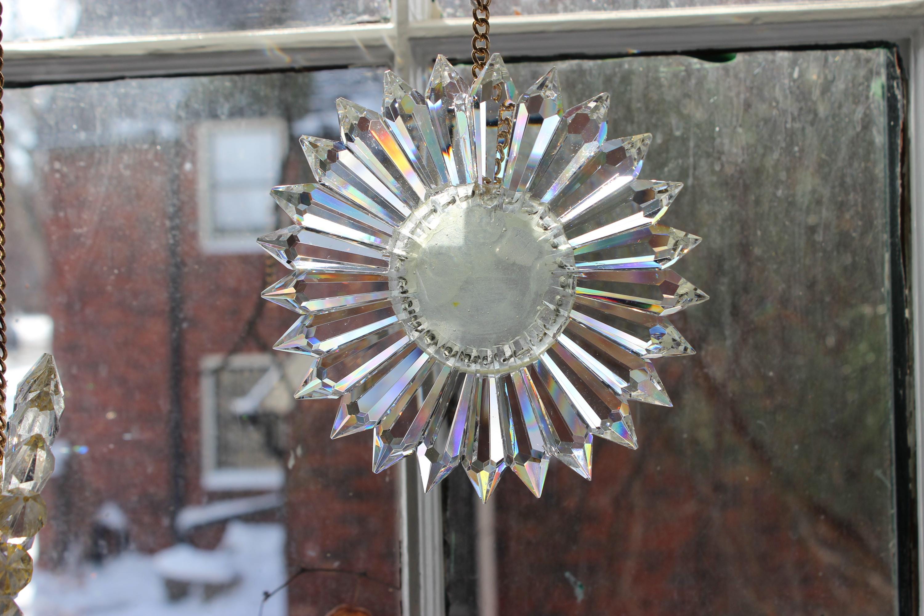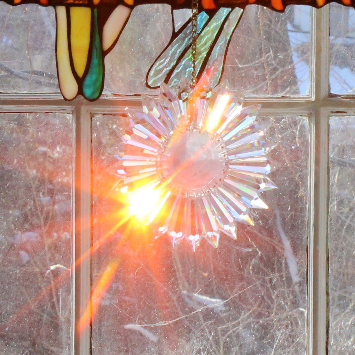 Turn any sunny window into a rainbow show with this handmade SunRain rainbow maker. Made in my Omaha studio, it uses 25 high-quality Egyptian lead-glass prisms from Asfour Crystals, each 2" long with 16 facets to spread light into vivid color. Arranged in a daisy-like circle, the prisms scatter sunlight into bright bands of red, orange, yellow, green, blue, and violet that move across your walls, floors, and ceiling as the sun shifts. It works beautifully in east, south, or west windows, turning morning or afternoon light into moving art.