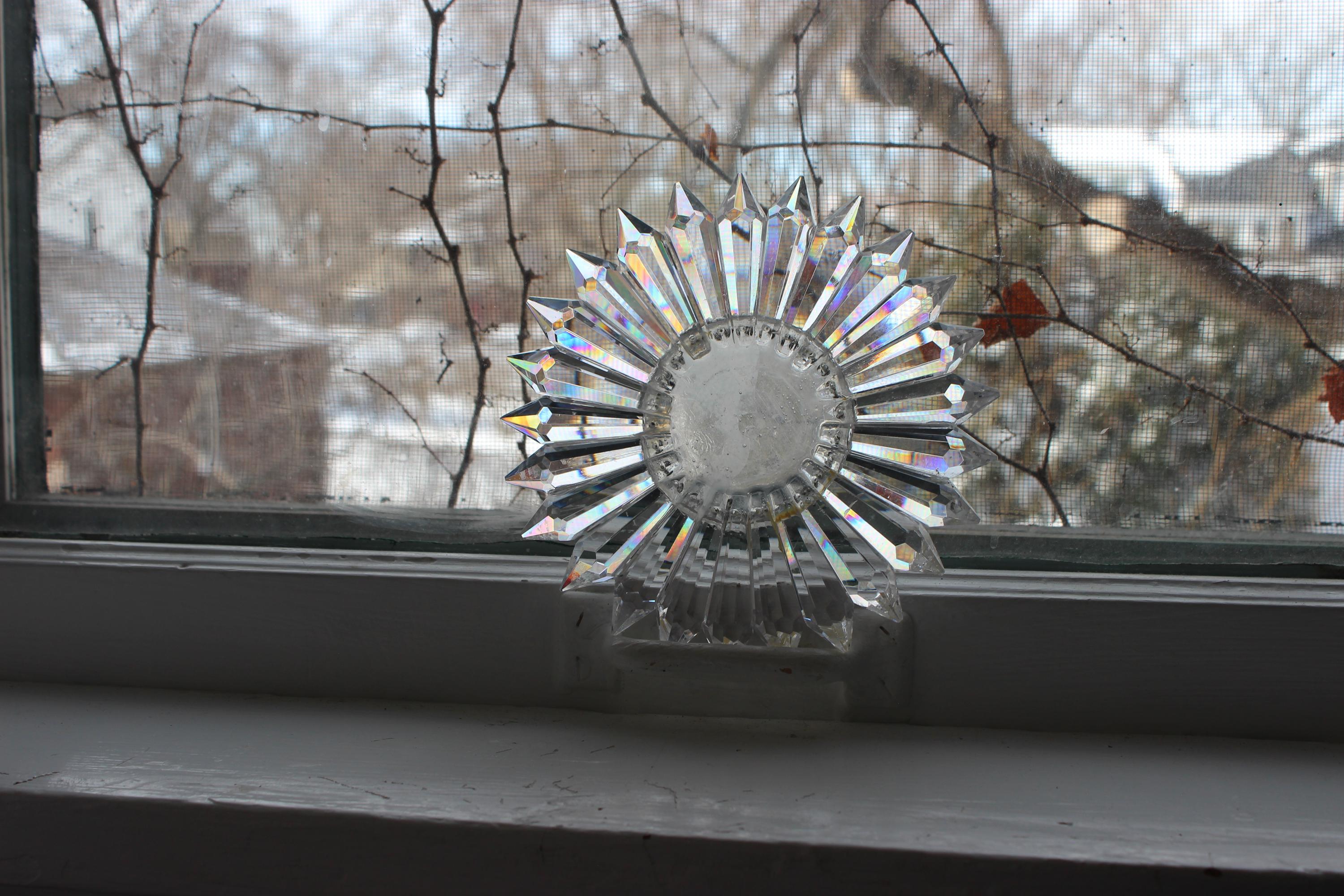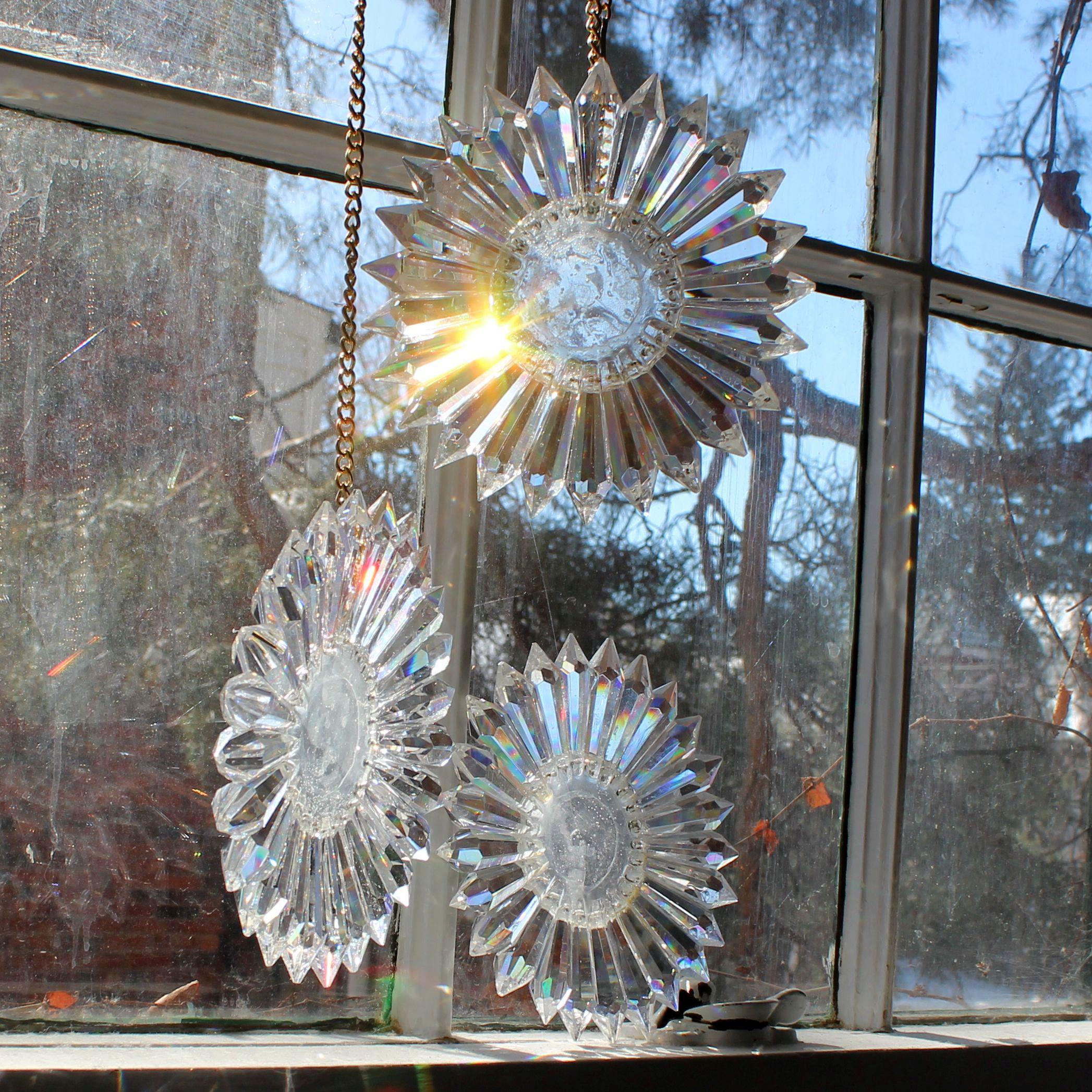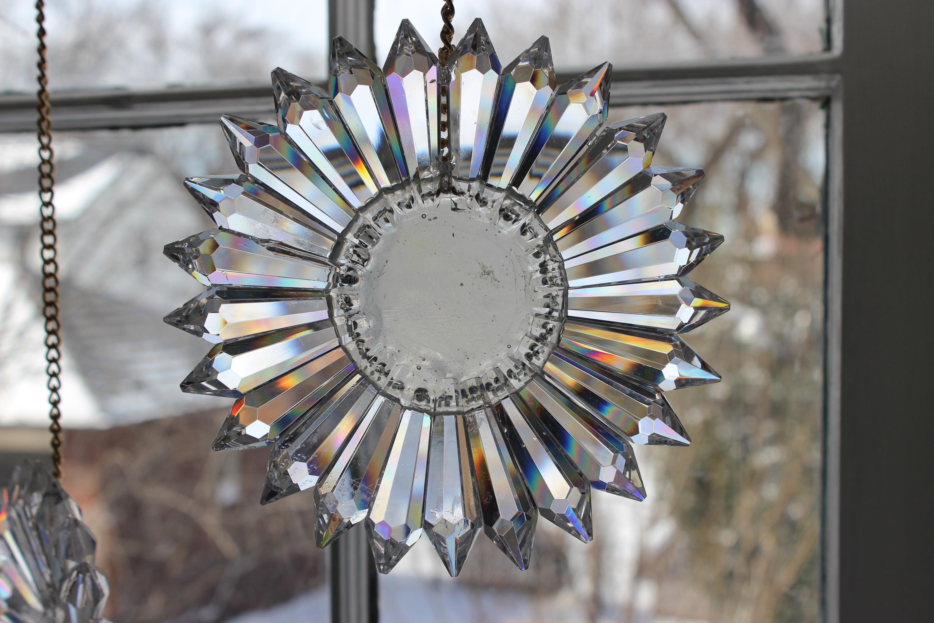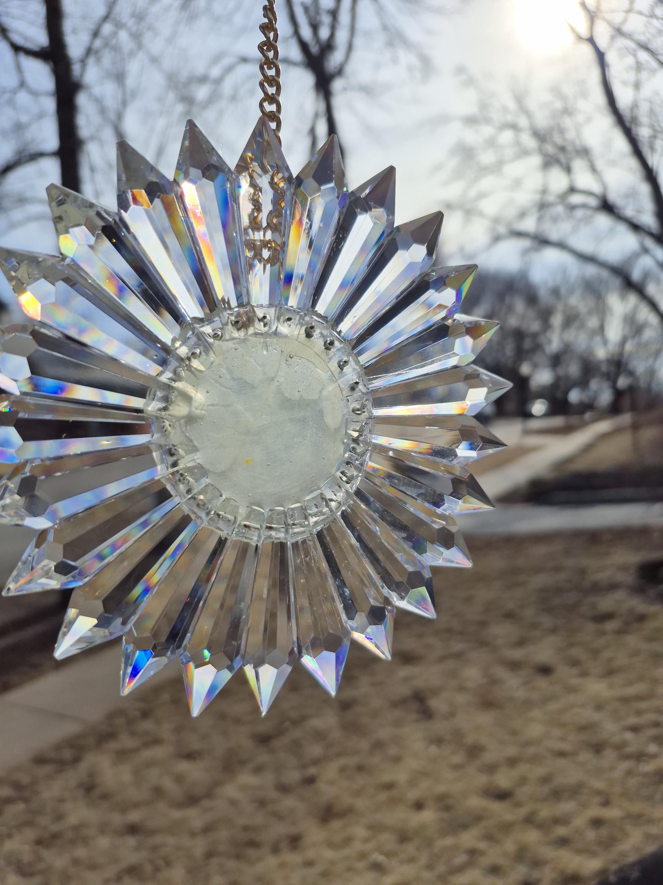 Turn any sunny window into a rainbow show with this handmade SunRain rainbow maker. Made in my Omaha studio, it uses 25 high-quality Egyptian lead-glass prisms from Asfour Crystals, each 2" long with 16 facets to spread light into vivid color. Arranged in a daisy-like circle, the prisms scatter sunlight into bright bands of red, orange, yellow, green, blue, and violet that move across your walls, floors, and ceiling as the sun shifts. It works beautifully in east, south, or west windows, turning morning or afternoon light into moving art.