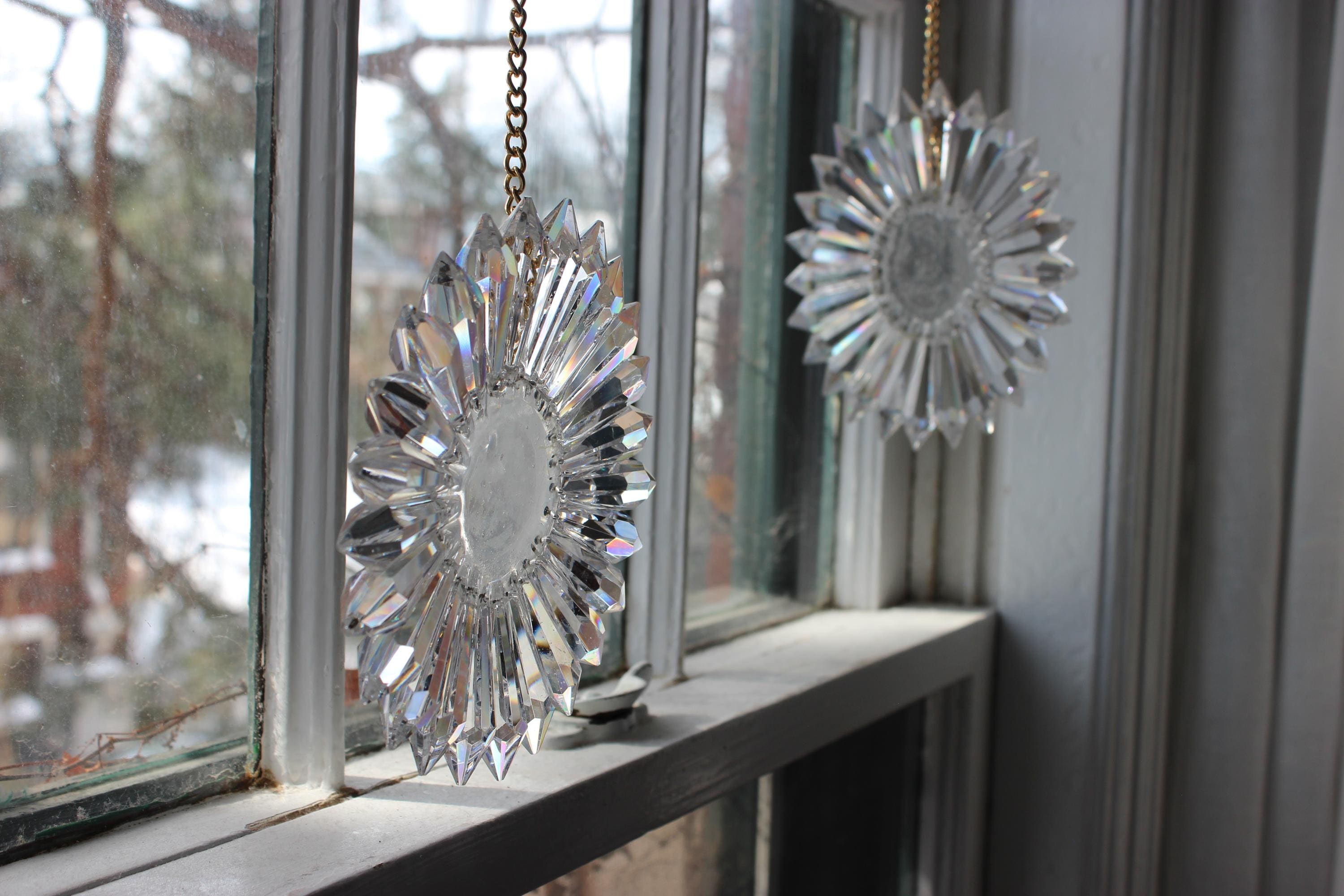 Each SunRain is built to last. Epoxy resin and tiny nails hold every prism firmly in place, combining sparkle with durability. Most SunRains come with a 2‑foot gold-colored chain, but you can also simply stand the piece in a window. The chain has a lanyard clip for easy hanging, and I include small gold nails if you prefer to mount it—just a hammer needed. It ships well protected in a sleek black gift bag, ready to give or display right away.