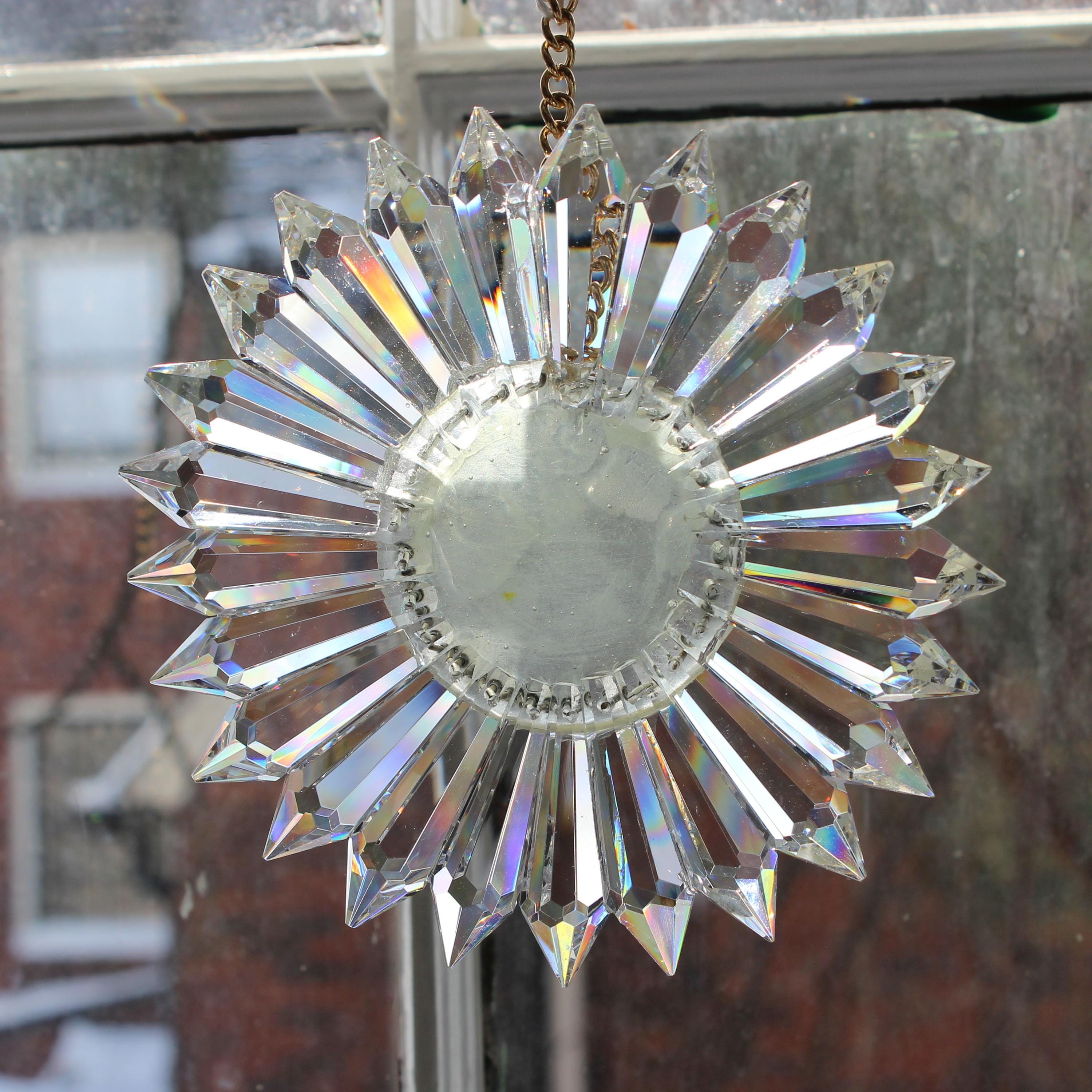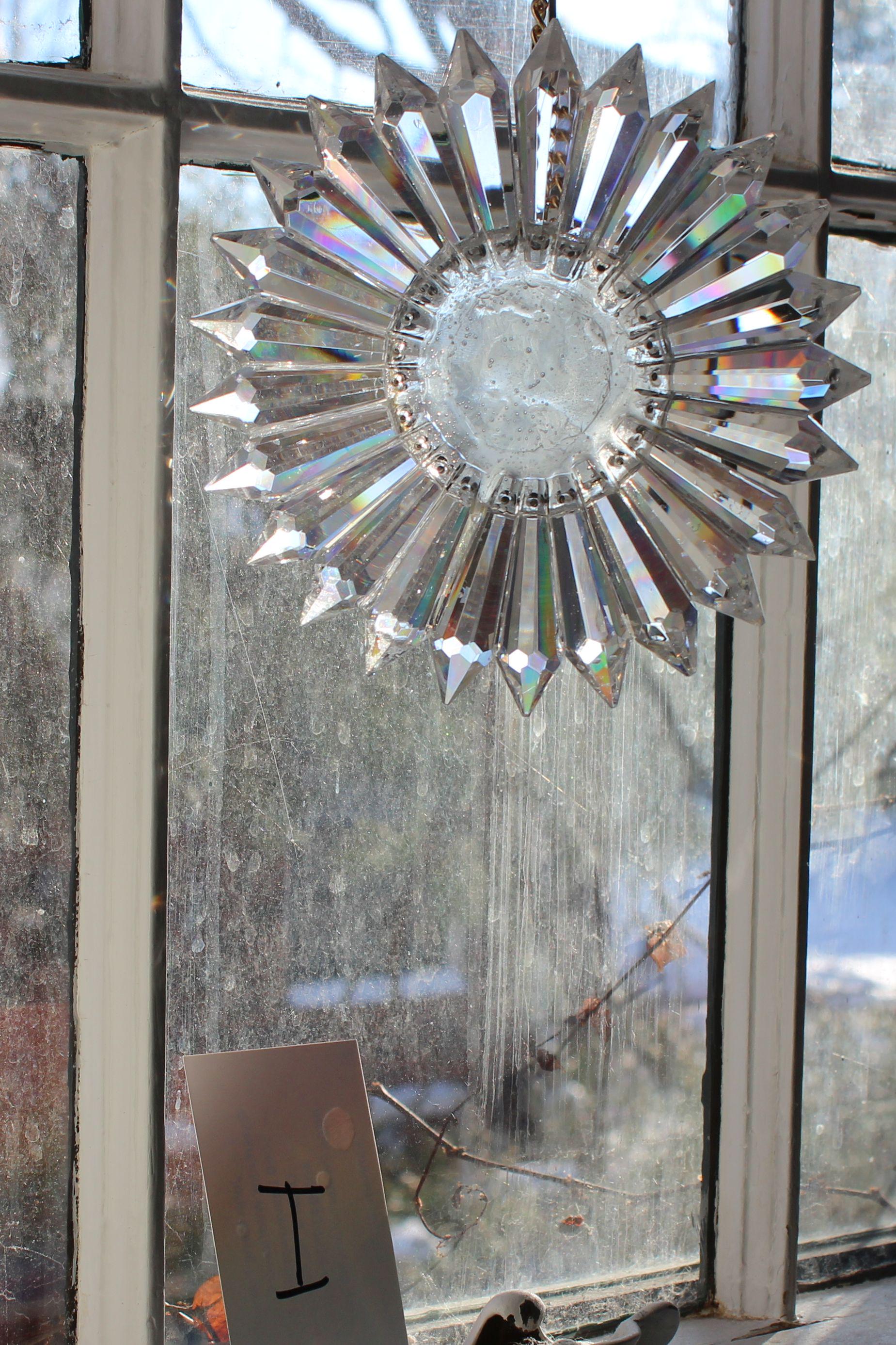 Turn any sunny window into a rainbow show with this handmade SunRain rainbow maker. Made in my Omaha studio, it uses 25 high-quality Egyptian lead-glass prisms from Asfour Crystals, each 2" long with 16 facets to spread light into vivid color. Arranged in a daisy-like circle, the prisms scatter sunlight into bright bands of red, orange, yellow, green, blue, and violet that move across your walls, floors, and ceiling as the sun shifts. It works beautifully in east, south, or west windows, turning morning or afternoon light into moving art.
