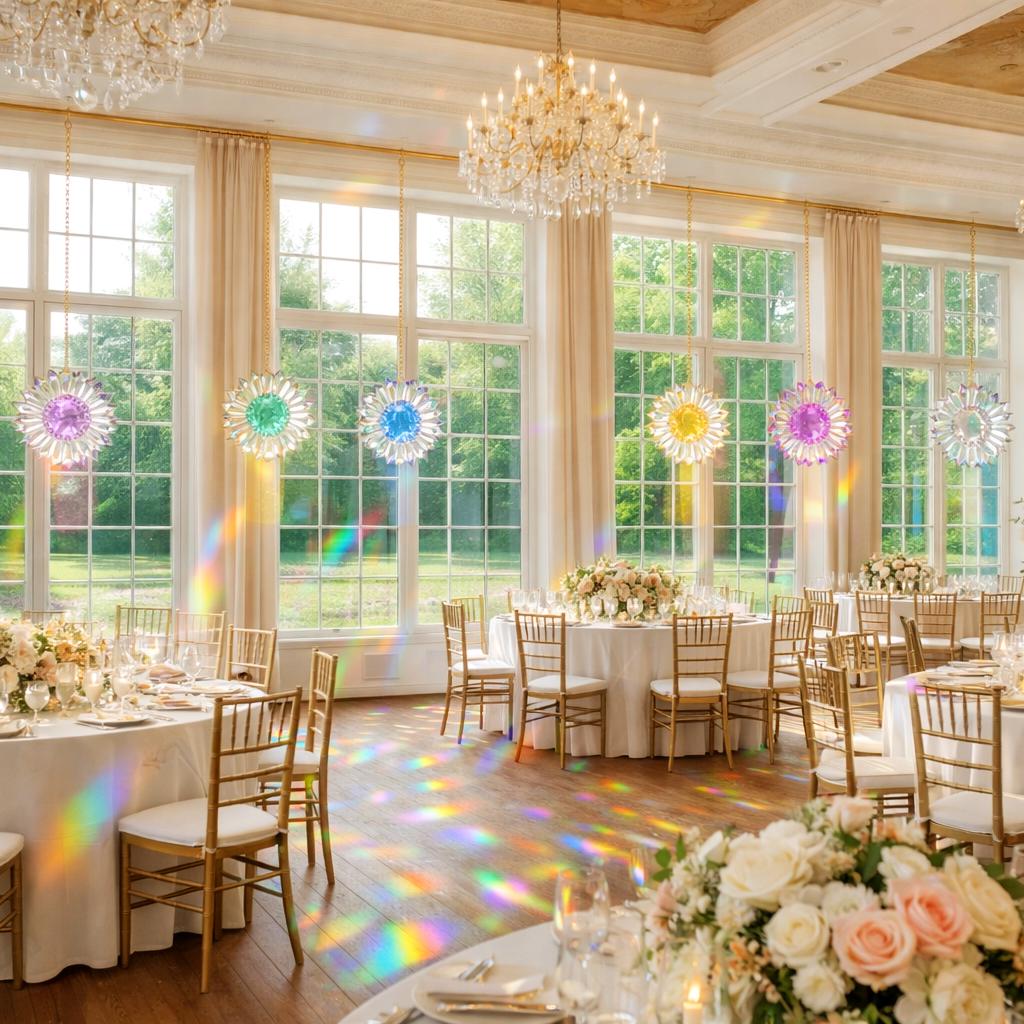 SunRain prism suncatchers appear under “favors,” but they can also serve as memorable decor. For a daytime reception in a room with windows, I can provide a SunRain for each sunny window so the space fills with rainbow light during the party. Afterward, the bride can gift them to her wedding party as keepsakes to hang at home.